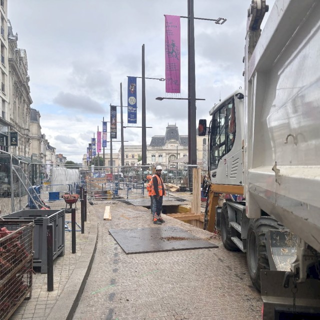 Dans le cadre du développement du réseau de chaleur urbain biomasse porté par MANS NORD Enr’gie, ATP2L & T2L accompagnent GT CANALISATION pour les travaux de terrassement et de pose de canalisations Place de la République et Avenue du Général de Gaulle.