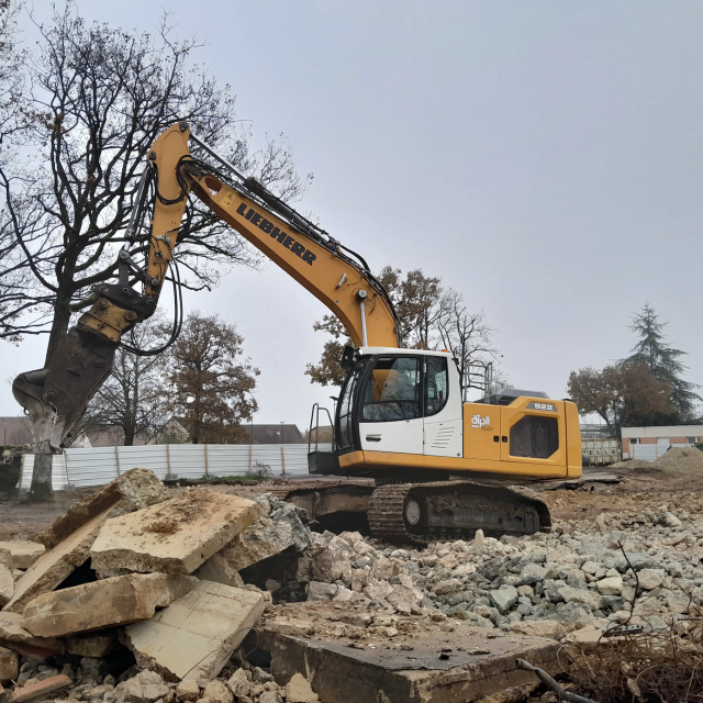 Grâce à notre pelle à chenilles 922 équipée d’un croc à béton, nous avons concassé les blocs de démolition pour les réutiliser directement sur site. Ensuite, notre chauffeur a nivelé et étalé ces matériaux, avant d’apporter 240 tonnes de béton recyclé pour finaliser la plateforme.