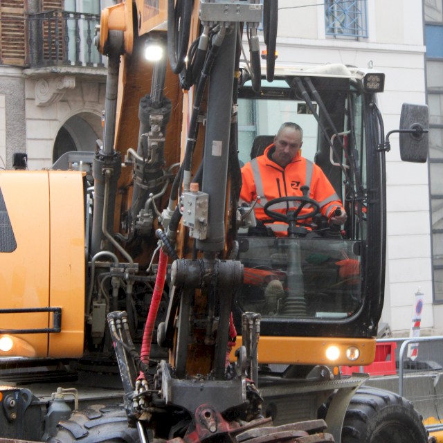 Sur l’Avenue Bollée, près de la pharmacie de Maupertuis, notre chauffeur de pelle LIEBHERR A 913, Christophe, collabore depuis près de 20 ans avec les équipes HRC.