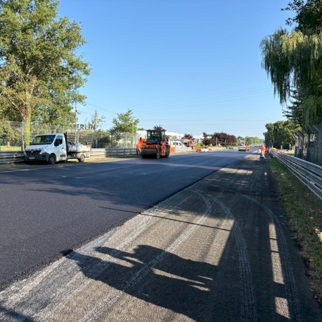 ATP2L & T2L est mobilisé aux côtés de COLAS pour participer à la réfection des enrobés sur la ligne droite des Hunaudières, portion emblématique du Circuit des 24 Heures du Mans, entre la chicane Daytona et le virage de Mulsanne.